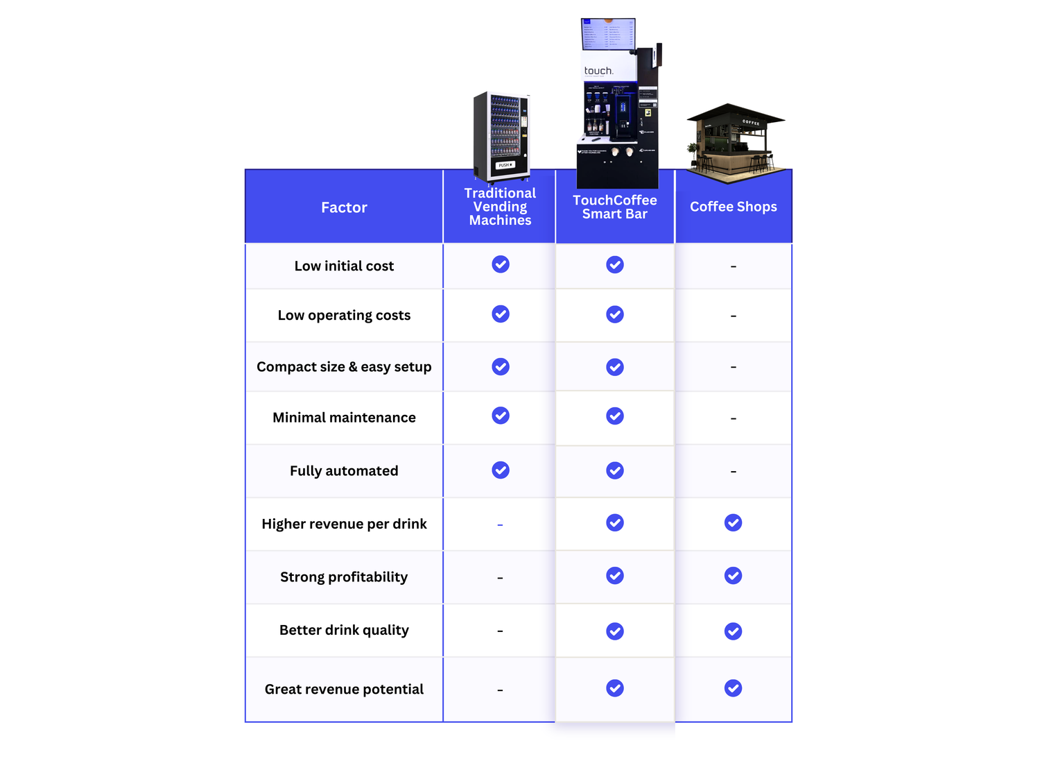 The Touch Coffee Smart Bar is your gateway to a profitable, low-maintenance coffee business that fits anywhere people gather